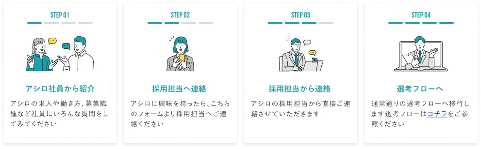 アシロでは、従業員が友人や知人を紹介して選考を進めるリファラル採用制度「知り合いリクルート」を設けています。
