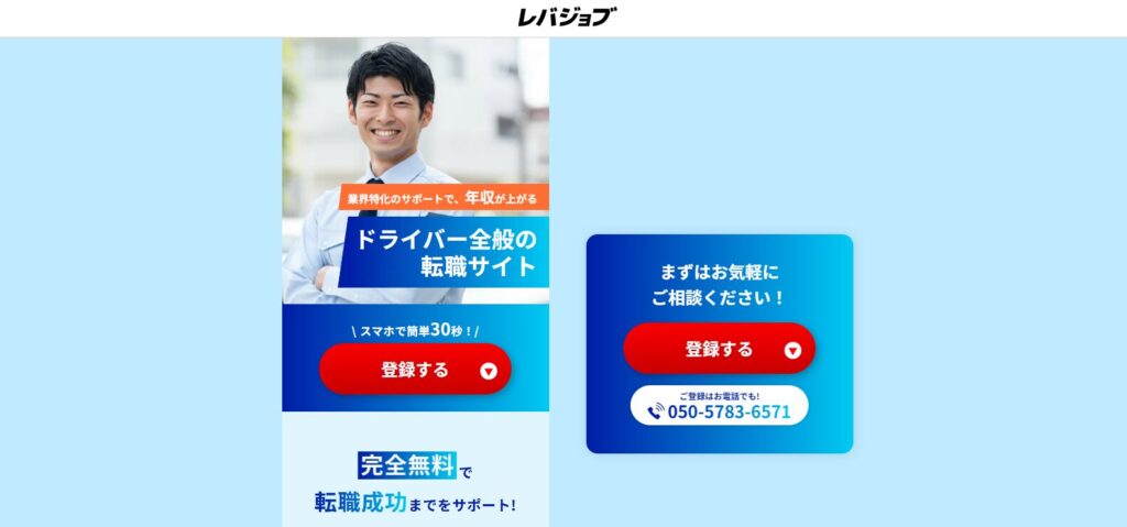 レバジョブは、ドライバー職に特化した転職支援サービスです。運営母体は、人材支援で15年以上の実績を持つレバレジーズグループです。
