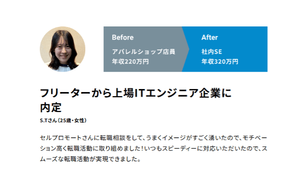 セルプロモートを利用した方からの口コミには「未経験でもエンジニアの求人を紹介してもらえた」という声が寄せられています。