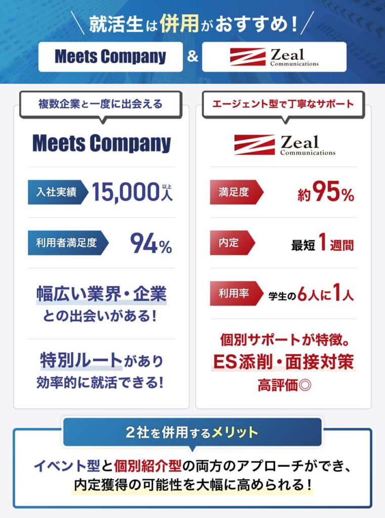 早期内定を目指す就活生には、ミーツカンパニーとジール就職エージェントの併用が効果的です。