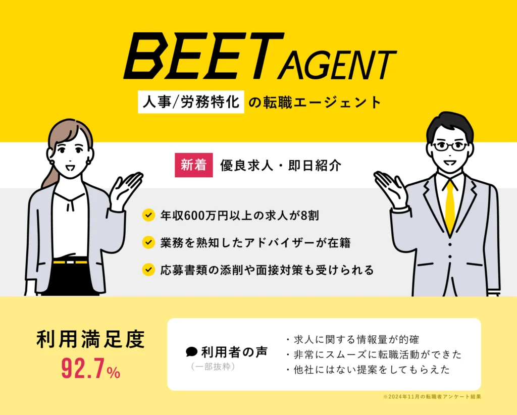 | BEET-AGENT(人事/労務) | 幅広い企業フェーズの人事求人を保有。リモート・フレックスの求人提案が可能 |