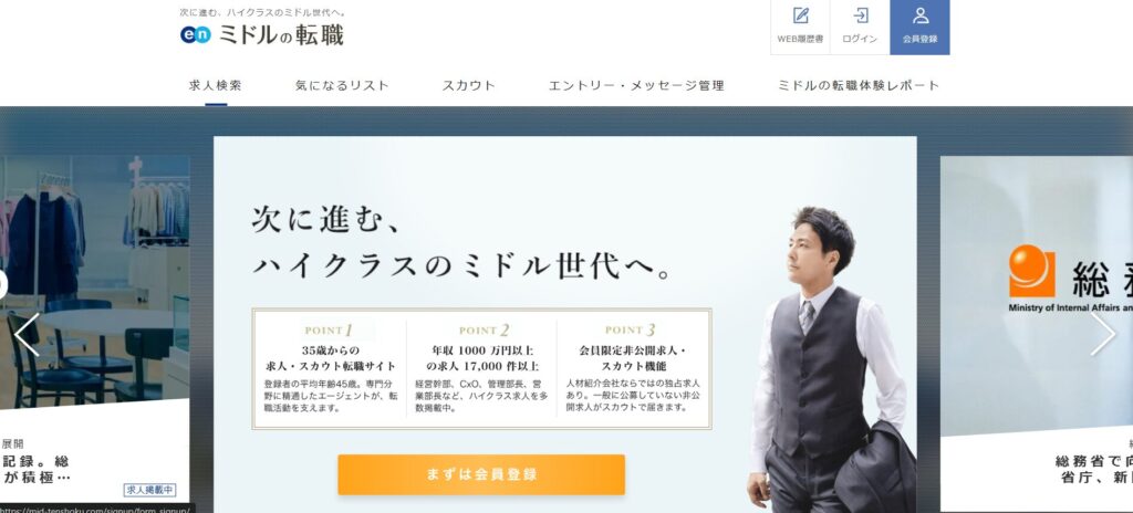 - 23位:en ミドルの転職|経験を活かせるミドル世代専門のスカウトサイト